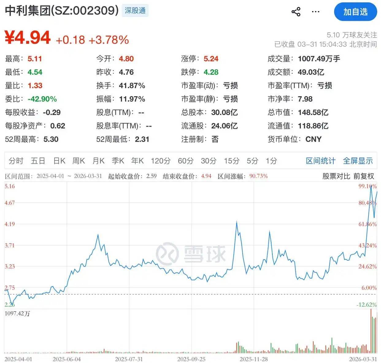 二级市场上,截至3月31日收盘,中利集团涨3.78%,报4.94元/股,总市值148.58亿元。